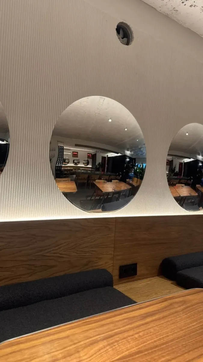 Интерьер кафе выполнен в современном минималистичном стиле с элементами индустриального дизайна. Потолок из грубого бетона с белым покрытием добавляет пространству текстурность, а стены, оформленные черными деревянными панелями, подчеркивают концепцию лофт. Внутри — функциональная барная стойка, столы и стулья из натурального дерева. В центре — стол с зеленой каменной столешницей, окруженный светлыми деревянными стульями в современном дизайне. На столе — ваза с живыми цветами.